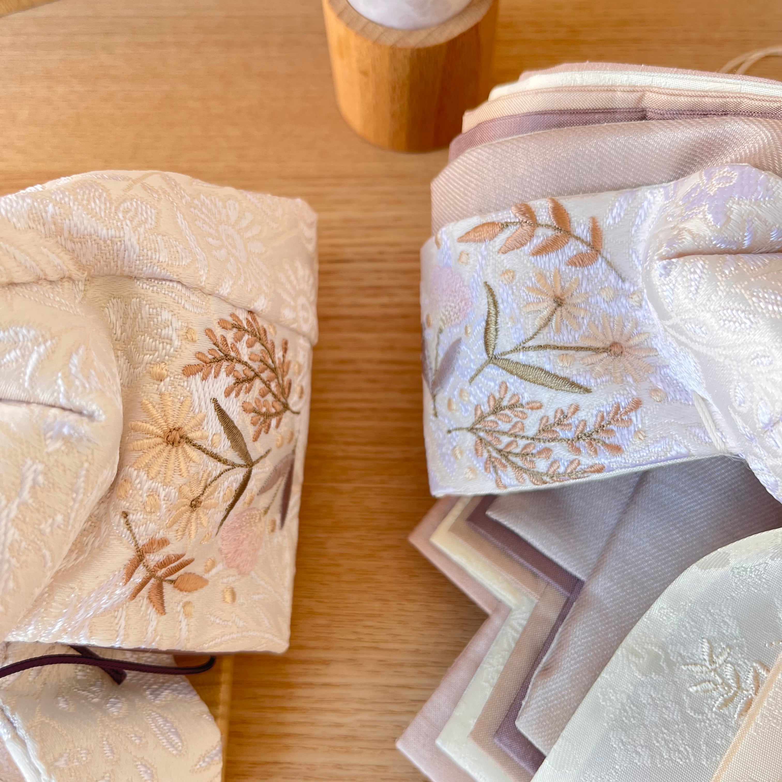 品よく華やかな雰囲気を醸し出しています。抑えた色合いの植物たちが織りなす美しい刺繍が可愛いらしく上品です。