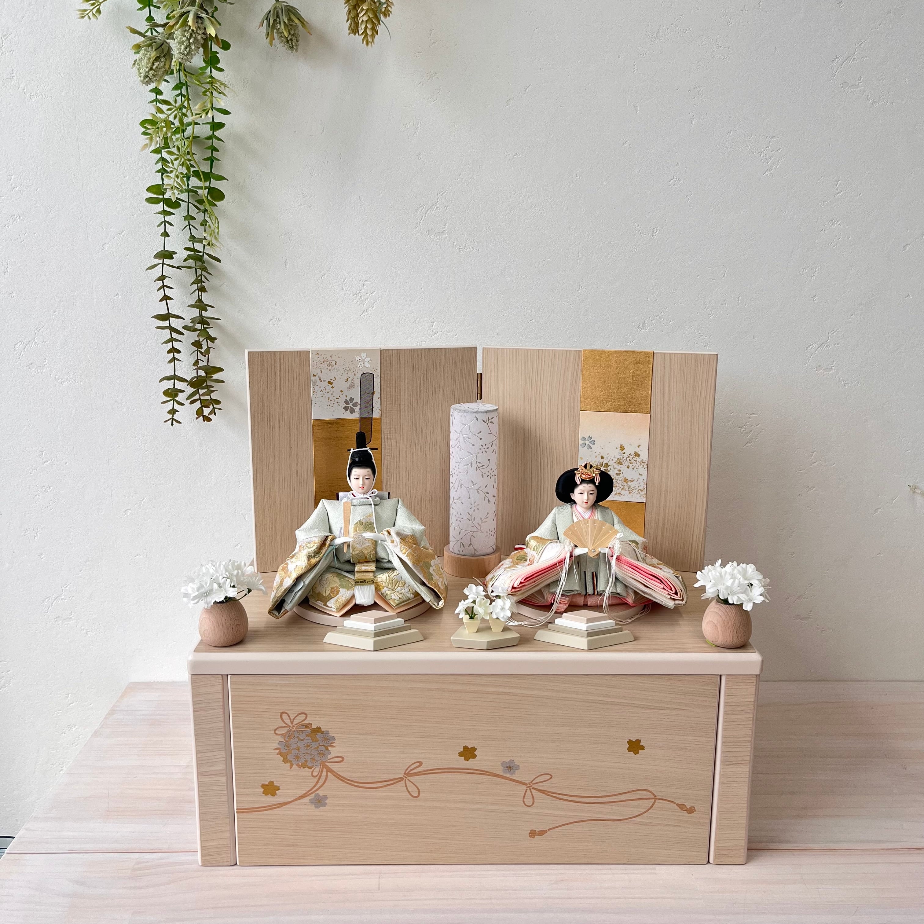 ## 商品名:わかば 春の暖かさをイメージしたお雛様 明るい緑色は新しい季節にふさわしく、 桜色の重ねが美しさを引き立てます。 銀糸が織生地に入っているので、 輝きが全体に艶が出て 華やかな雰囲気を醸し出します。 白いお花を両脇に 菱餅を淡いお色でアレンジ 愛らしい印象を与えます。 蔓草模様の雪洞で 優しく照らします。 飾り台は間口50cm✖︎奥行き29cm コンパクトに飾っていただけます。 間口50cm✖︎奥行き29cm✖︎高さ44.5cm