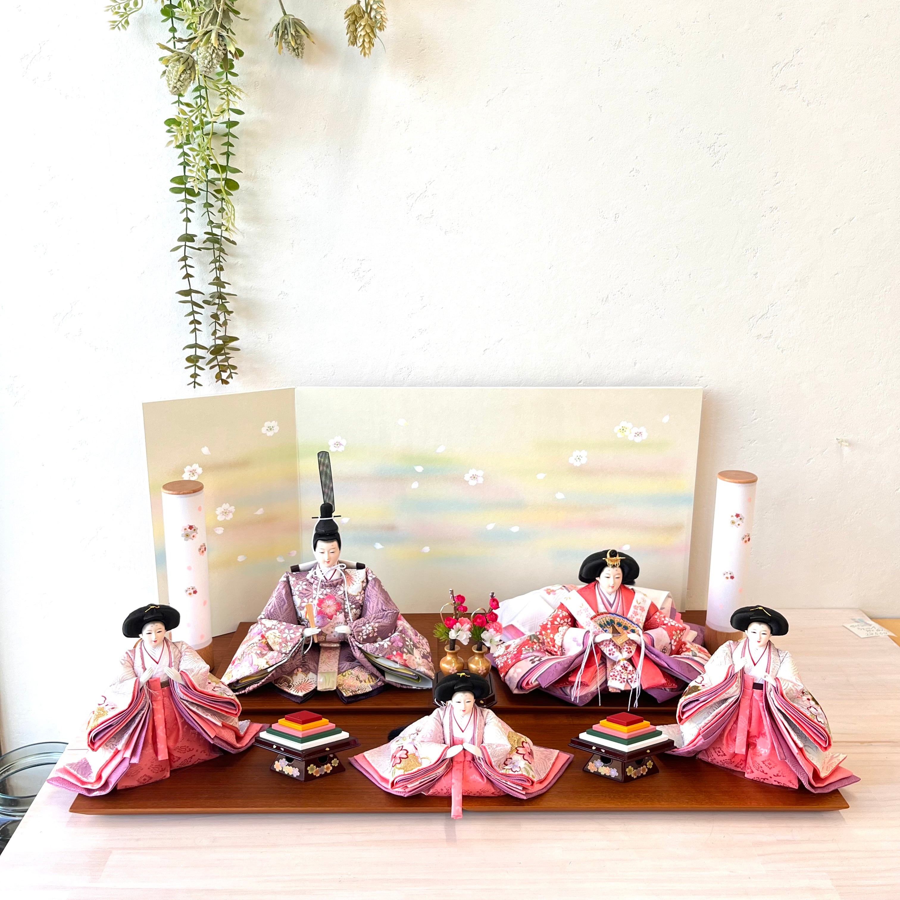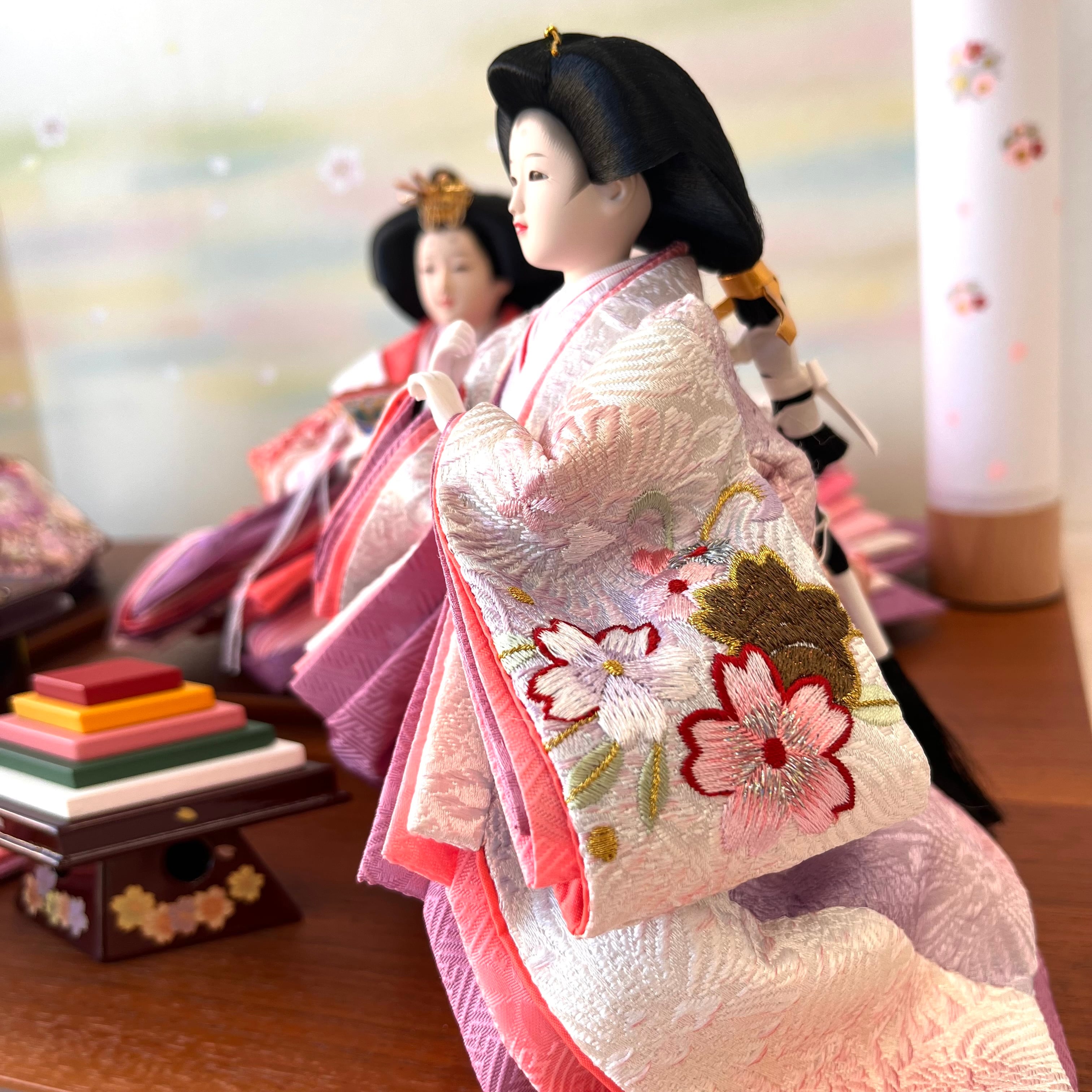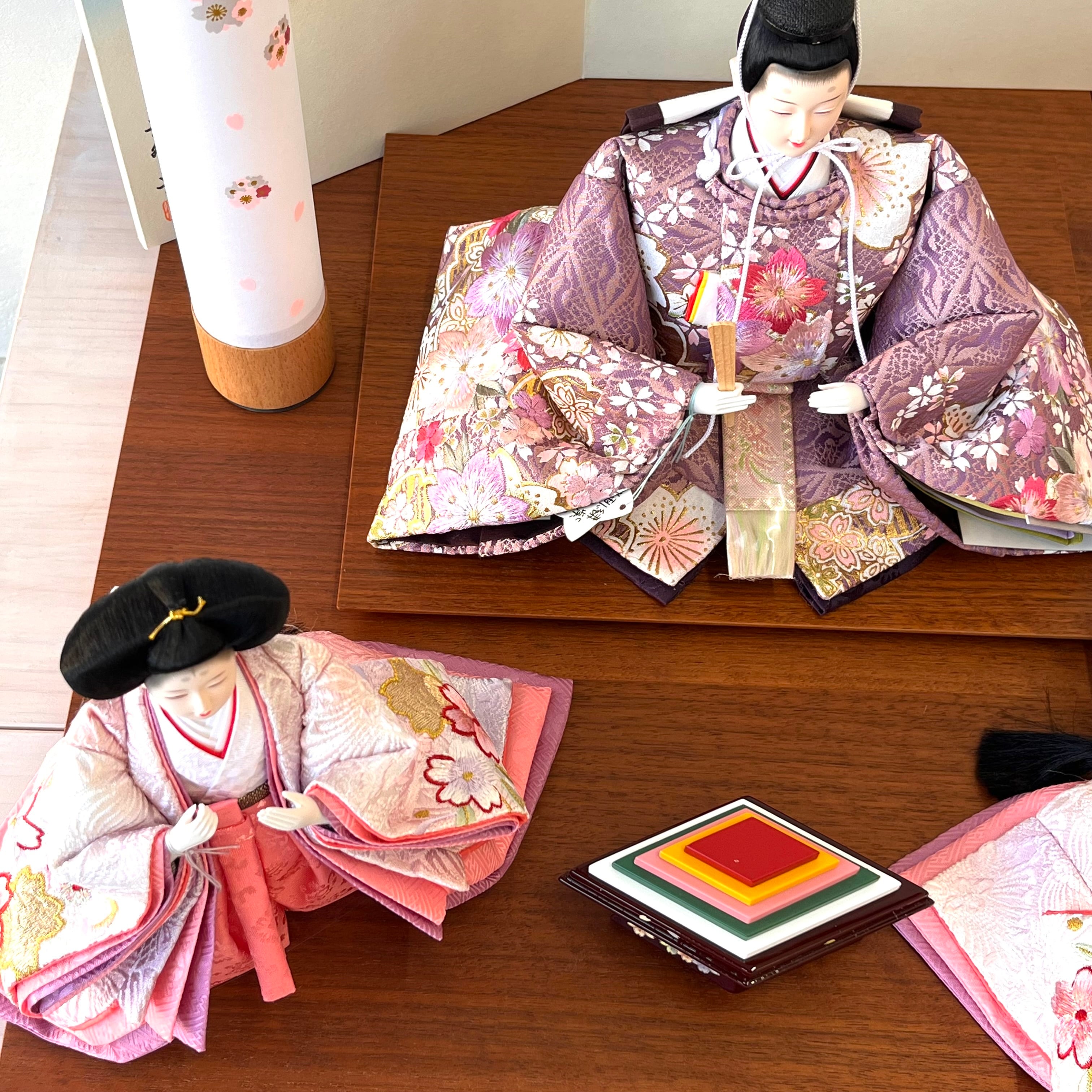 優雅さと華やかさを兼ね備えたお雛様です。紫と桃色のグラデーションが美しく、