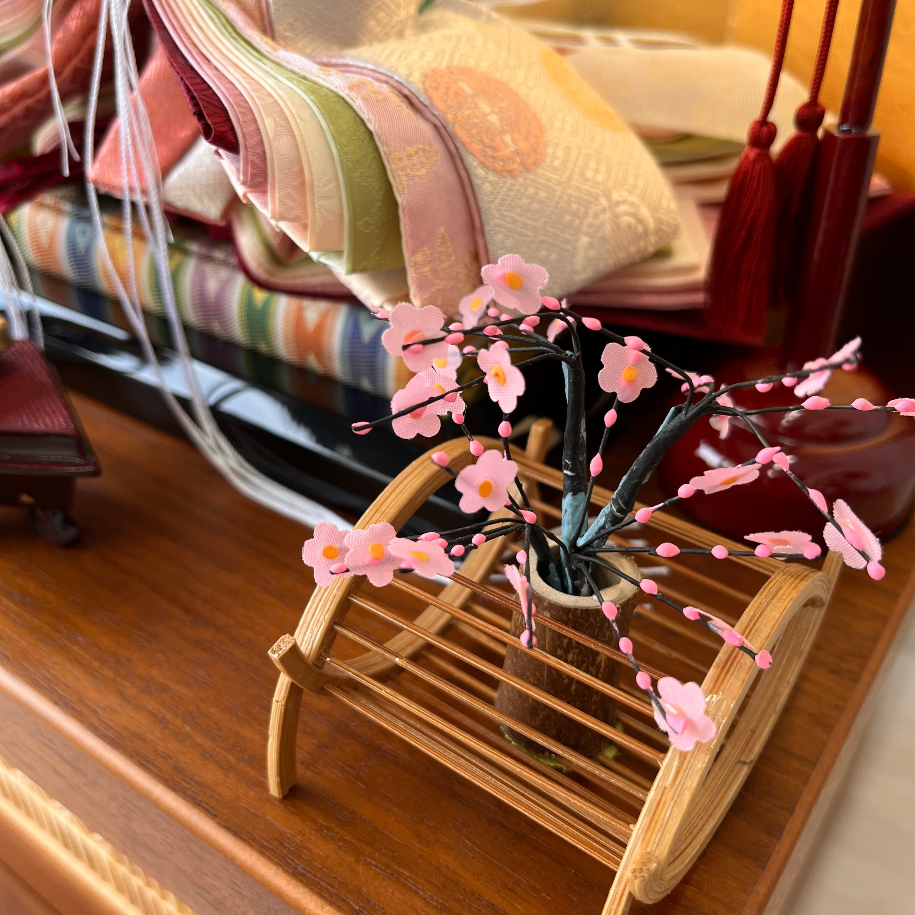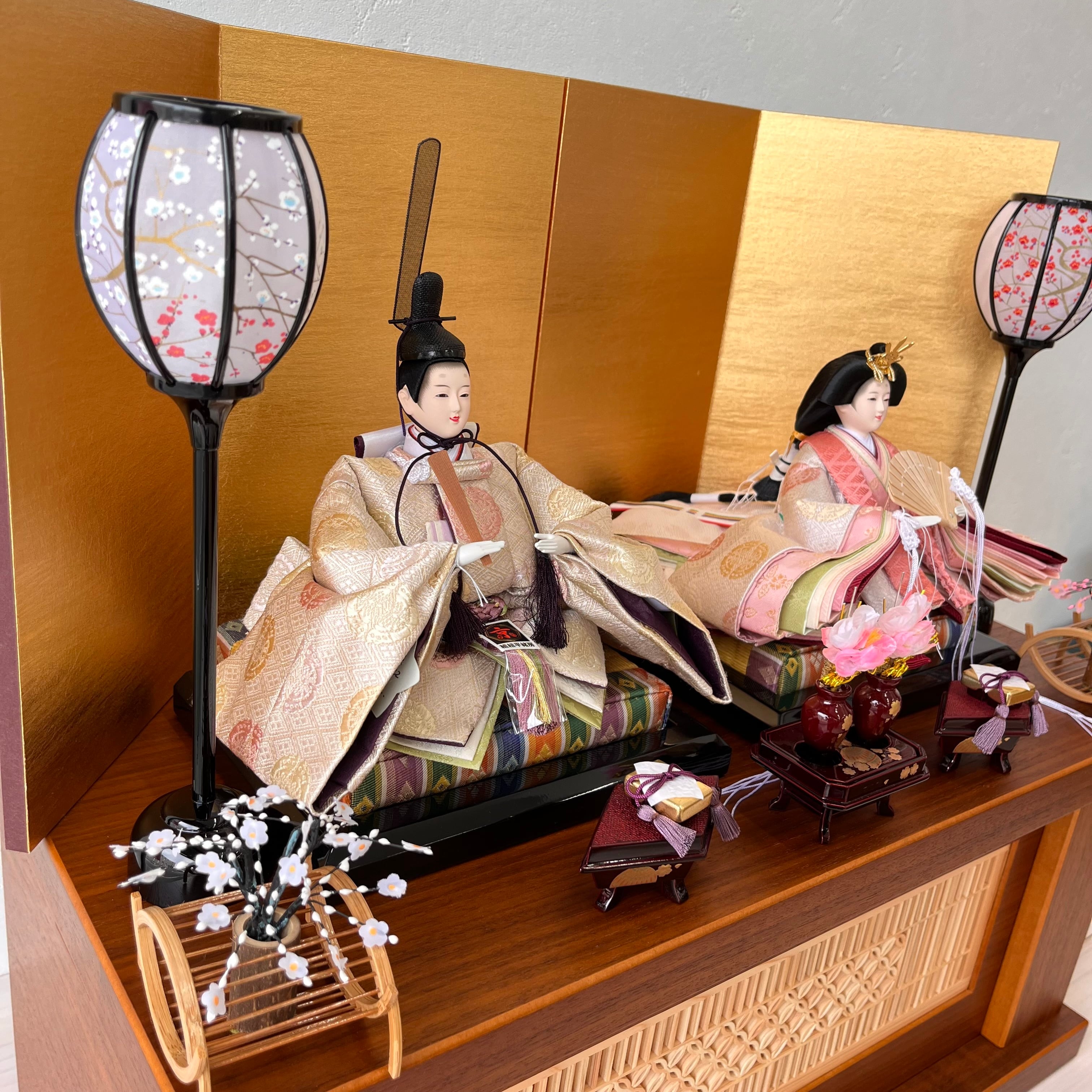 ## 商品名:みすず 有職紋様の繊細な向蝶で彩られ ベージュと桜色が絶妙に調和した柔らかな色合いが上品な雰囲気を醸し出します。 伝統的な美意識をそのままに 洗練されたお雛様になりました。 温もり溢れる組子細工の飾り台、 華やかな四曲金屏風が優雅さを添えます。 溜塗の前飾りと紅白梅の組み合わせが、さらにお雛様の美しさを際立たせます。 飾りやすさと収納のしやすさを実現したお雛様です。 間口60cm✖︎奥行き30.5cm✖︎高さ56.5cm