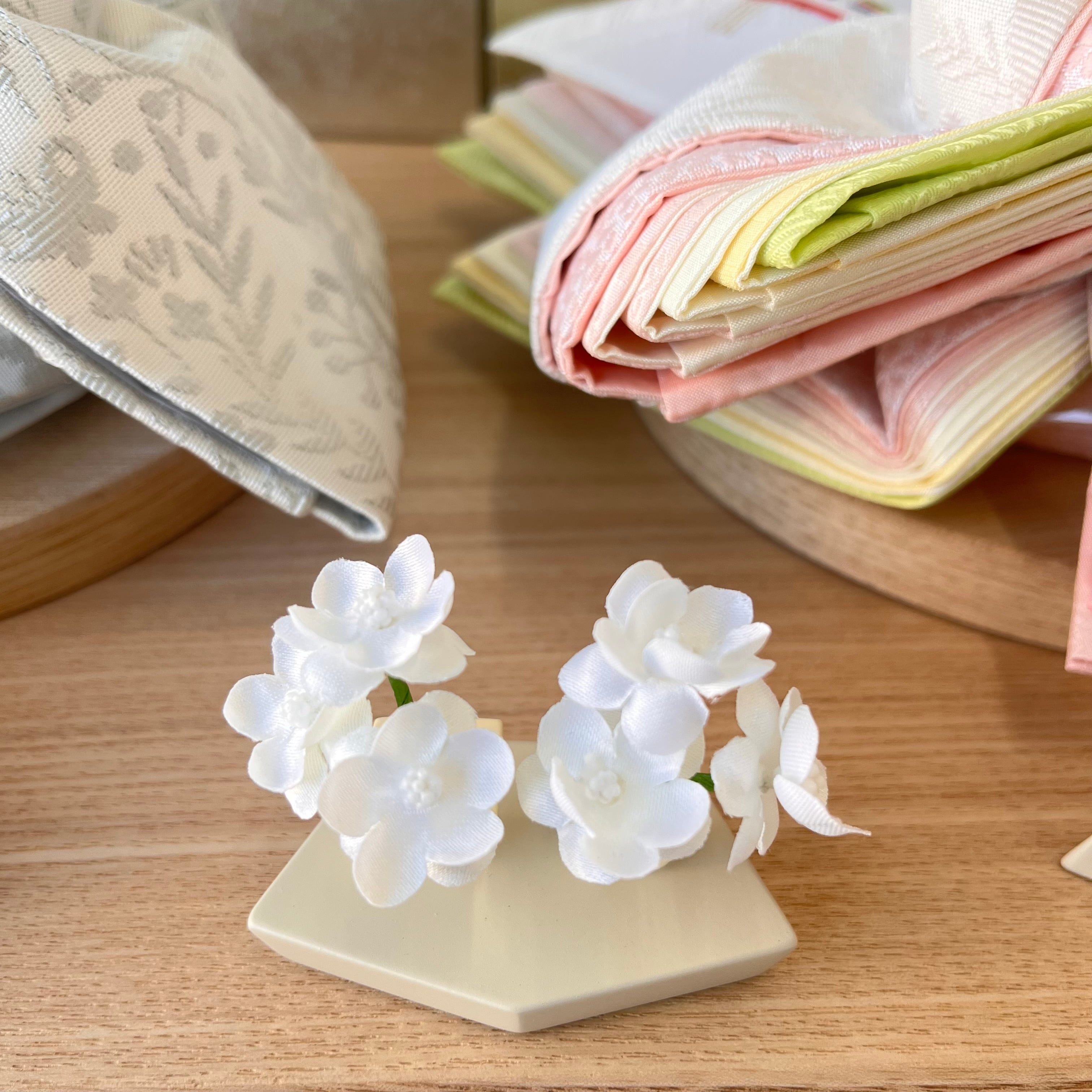 ## 商品名:ほなみ 伝統的な正絹の美しさが息づく「ほなみ」 幸せを象徴する小鳥や草花、蝶々のモチーフに織った博多帯を衣装に。 グレーに桜色のゆかしい色合いは 気高い雰囲気になりました。 優しいベージュ油灯 モカ色がお洒落な前飾り 木目飾り台と銀箔四曲屏風 お雛様を引き立てます。 飾りやすく、仕舞いやすい平飾りです。 間口60cm✖︎奥行き33cm✖️高さ33cm