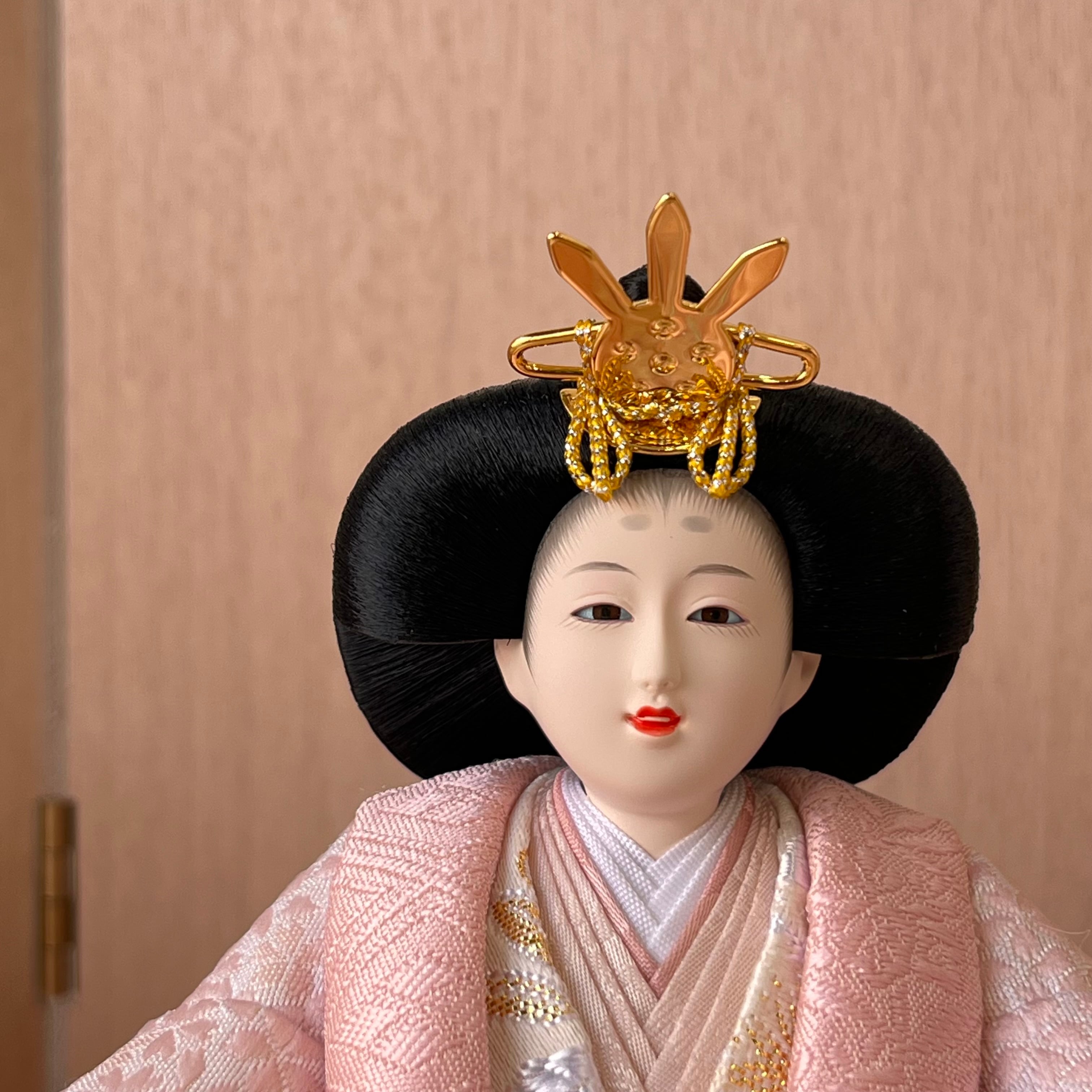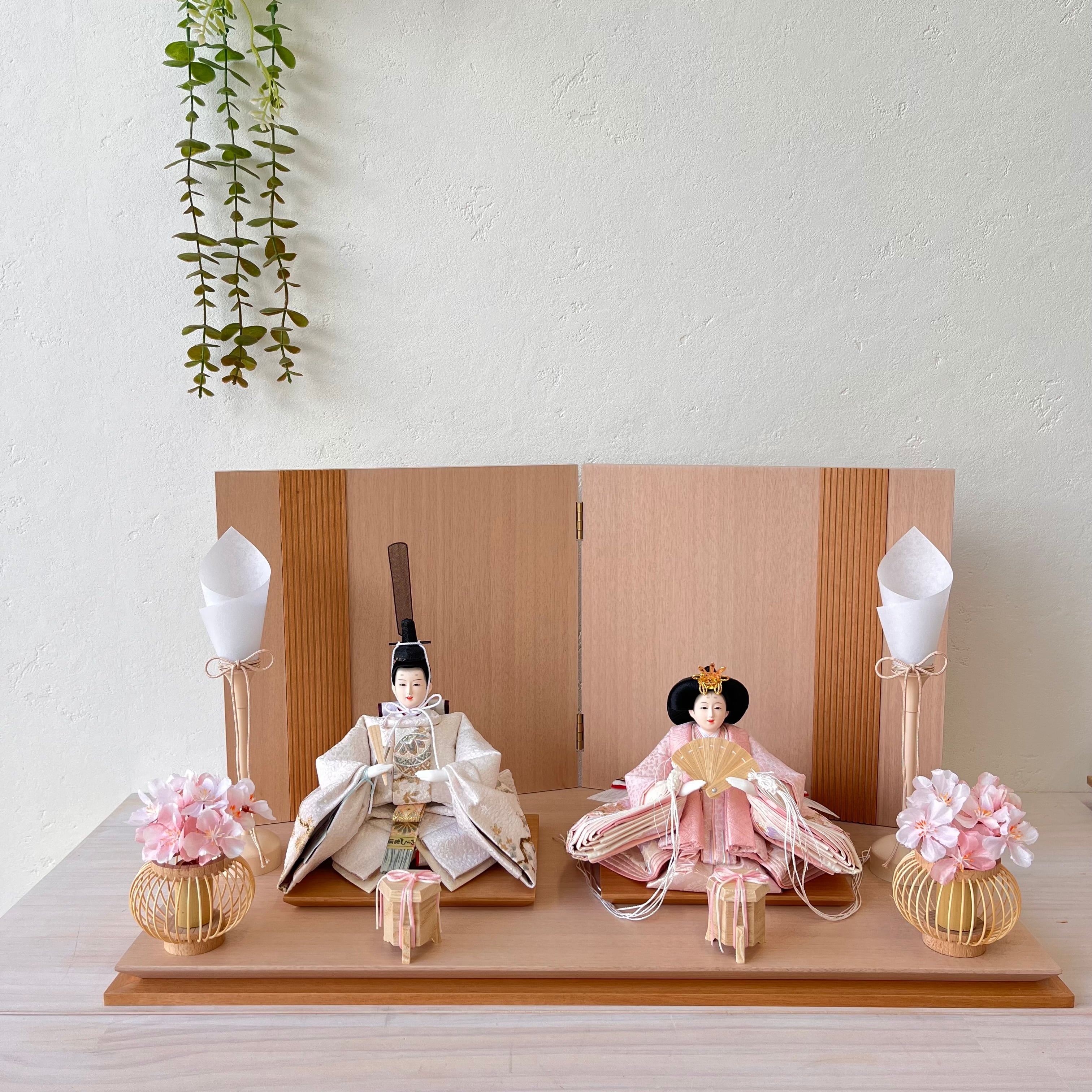## 商品名:てまり 金彩刺繍が魅力的な「てまり」 立体的な毱の刺繍を胸元や袂にデザイン 地模様は可愛い桜模様。 乳白色と桜色の組み合わせが、 どこか温かみのある可愛らしさです。 木製の飾り台には、 色違いの木目でアクセントをつけました。 二曲屏風や桜花籠が、飾る楽しさを倍増させます。 ベージュ油灯が柔らかな光を灯し、 全体に暖かさを添えます。 間口55cm✖︎奥行き30cm✖︎高さ29cm
