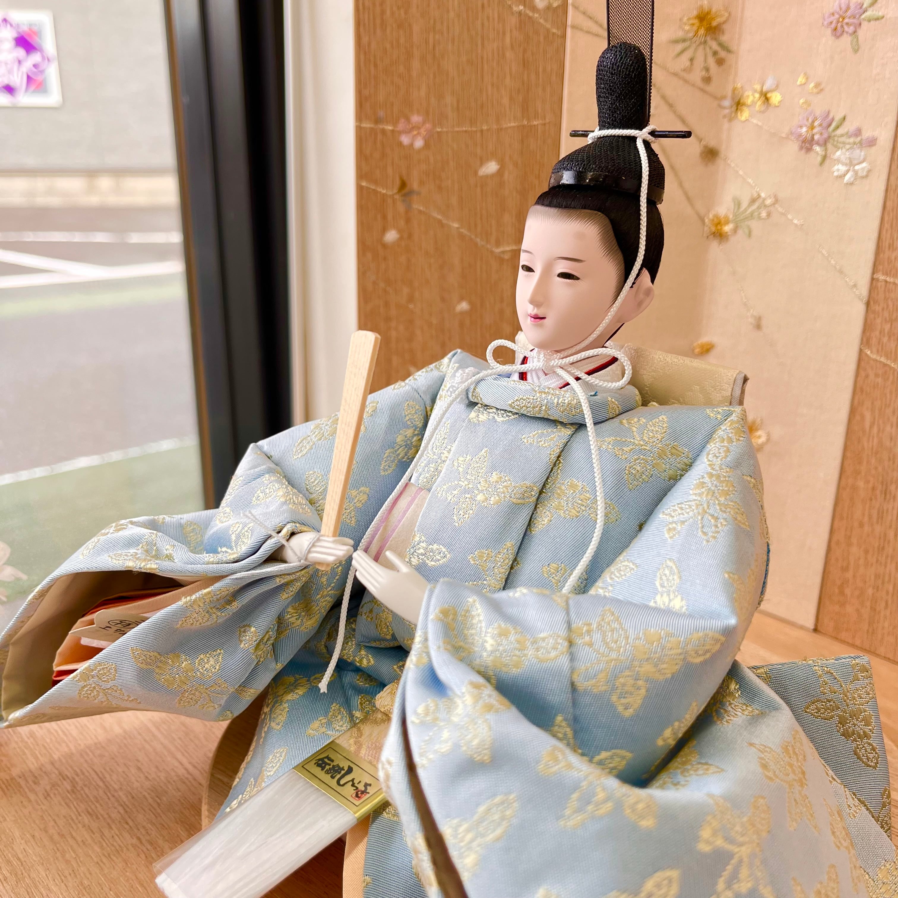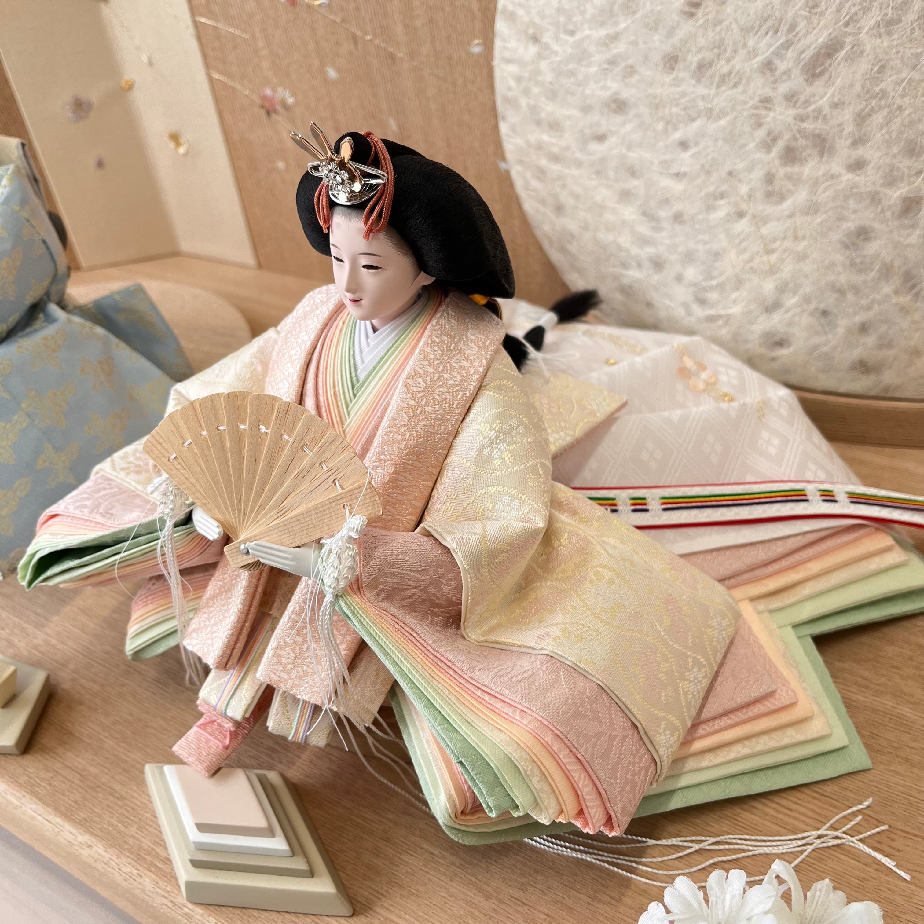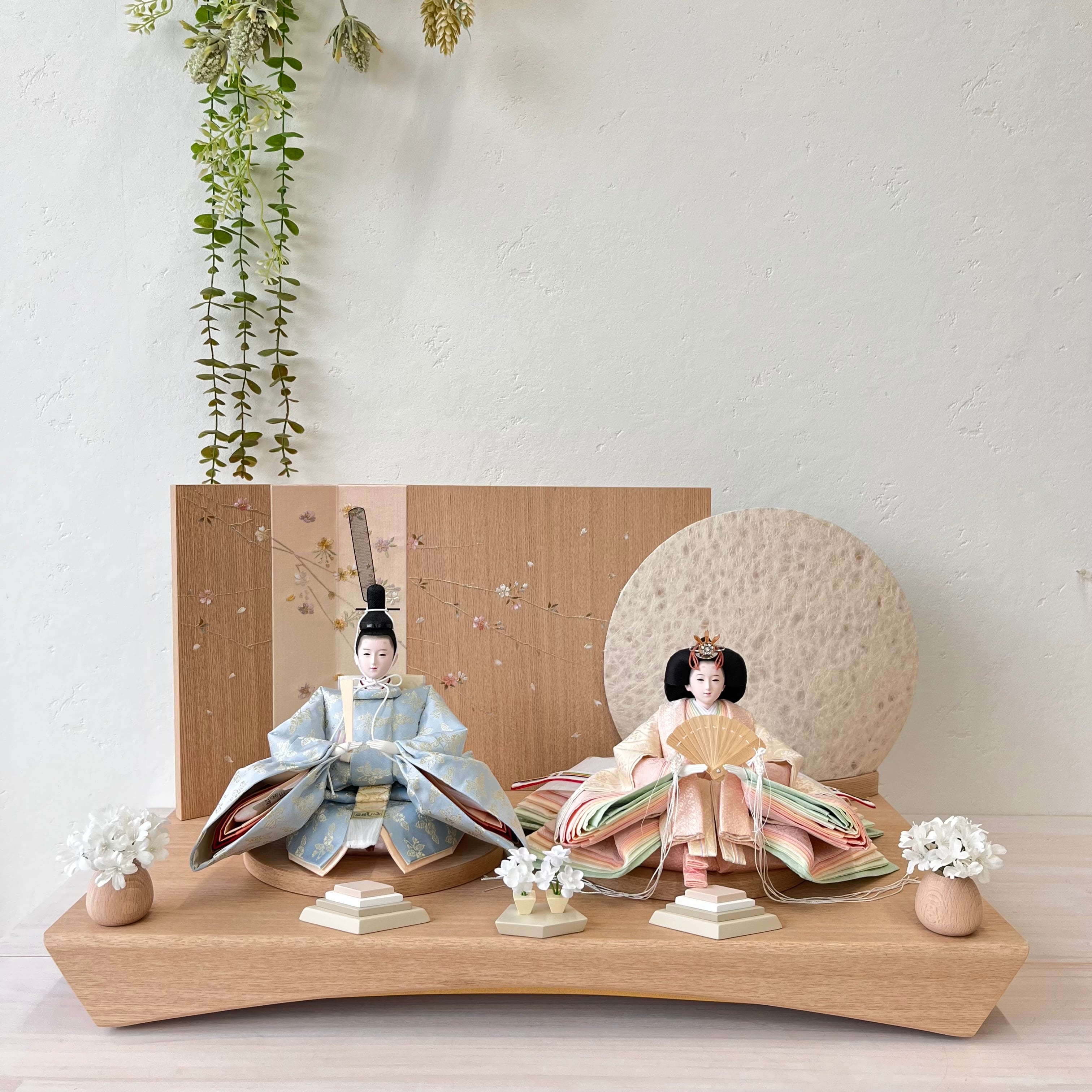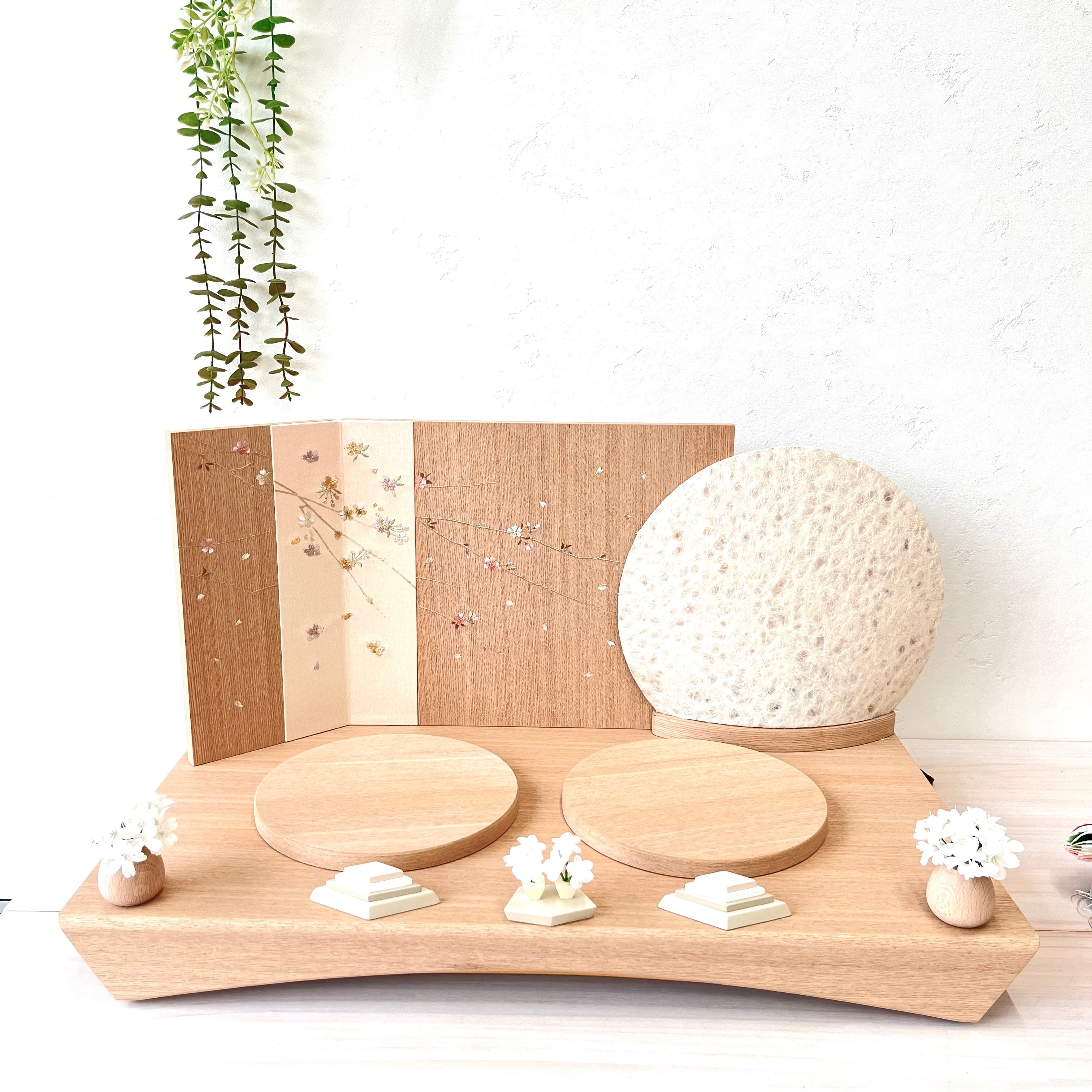 桜刺繍の屏風と木目の飾り台が、