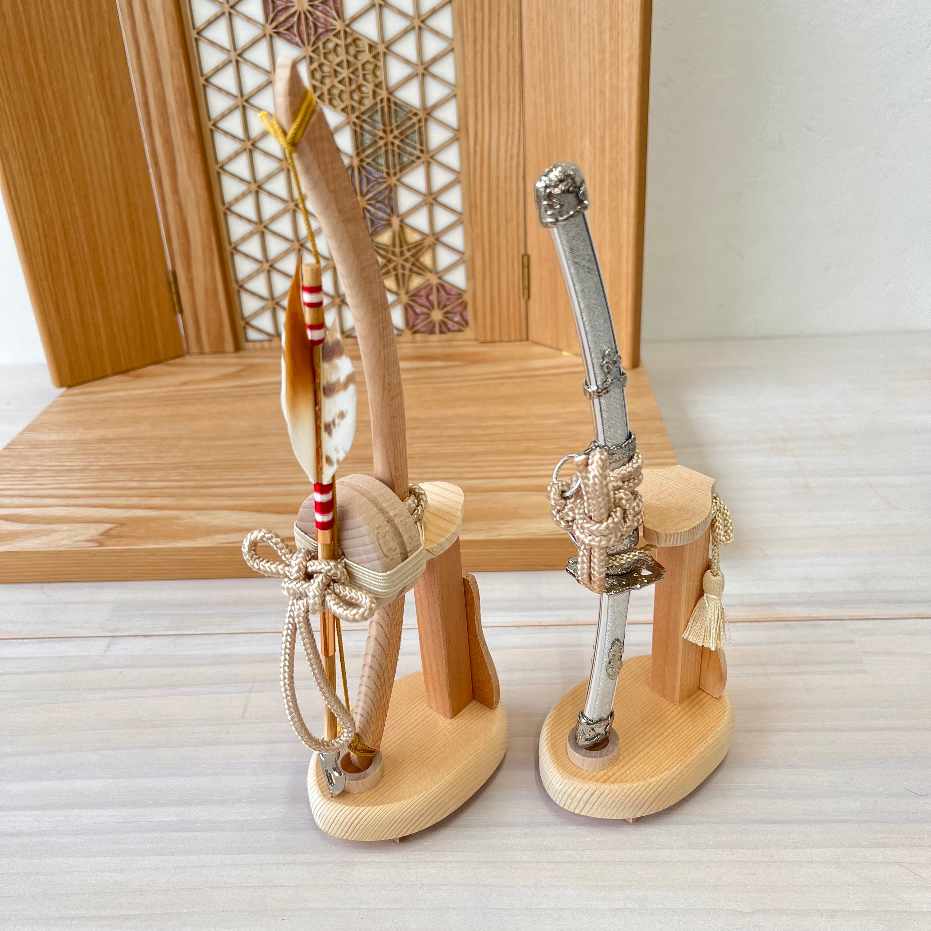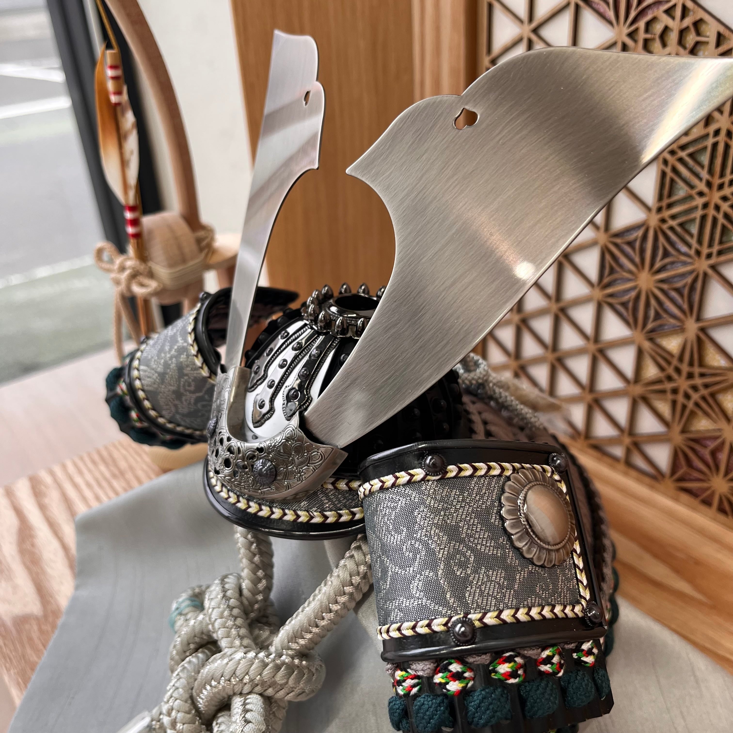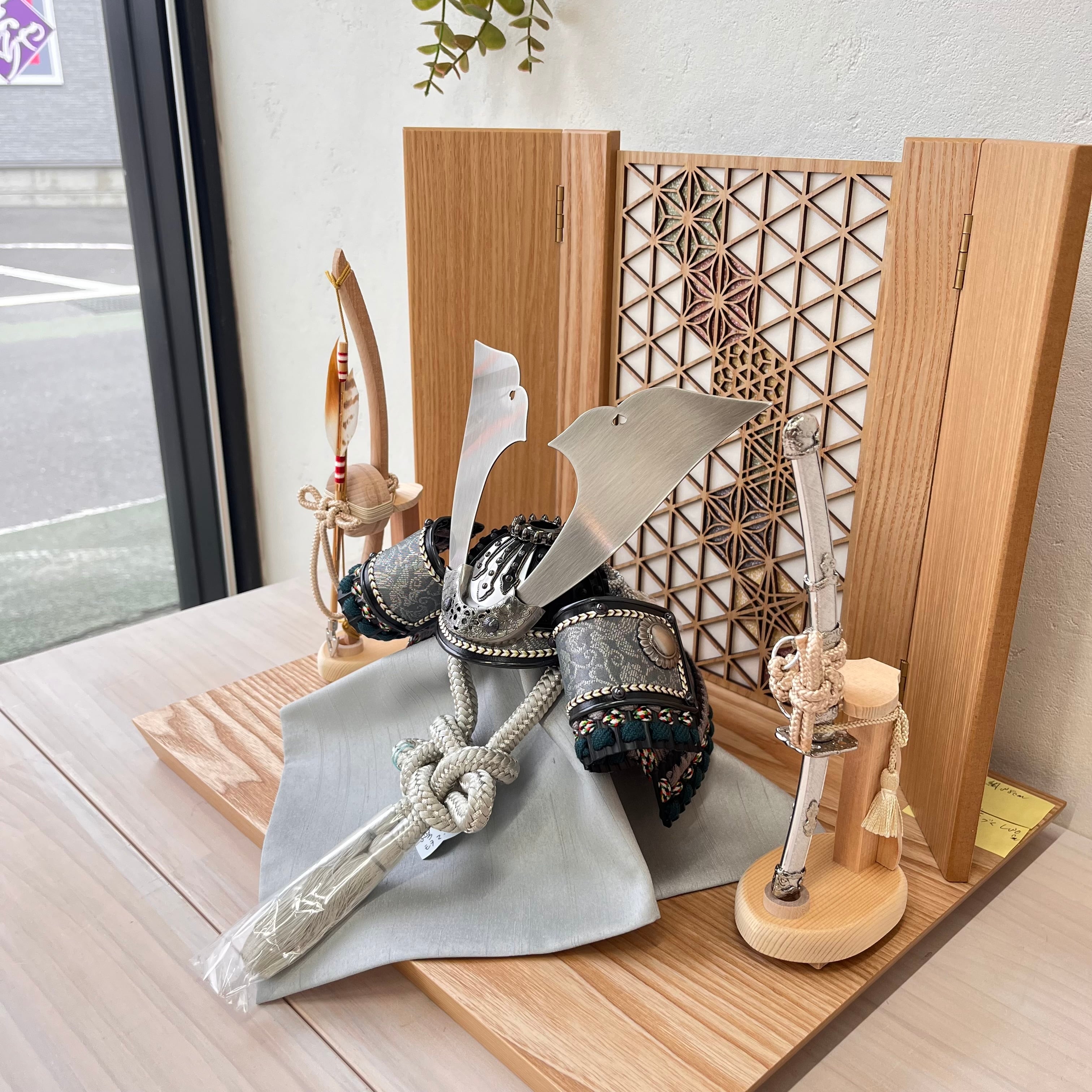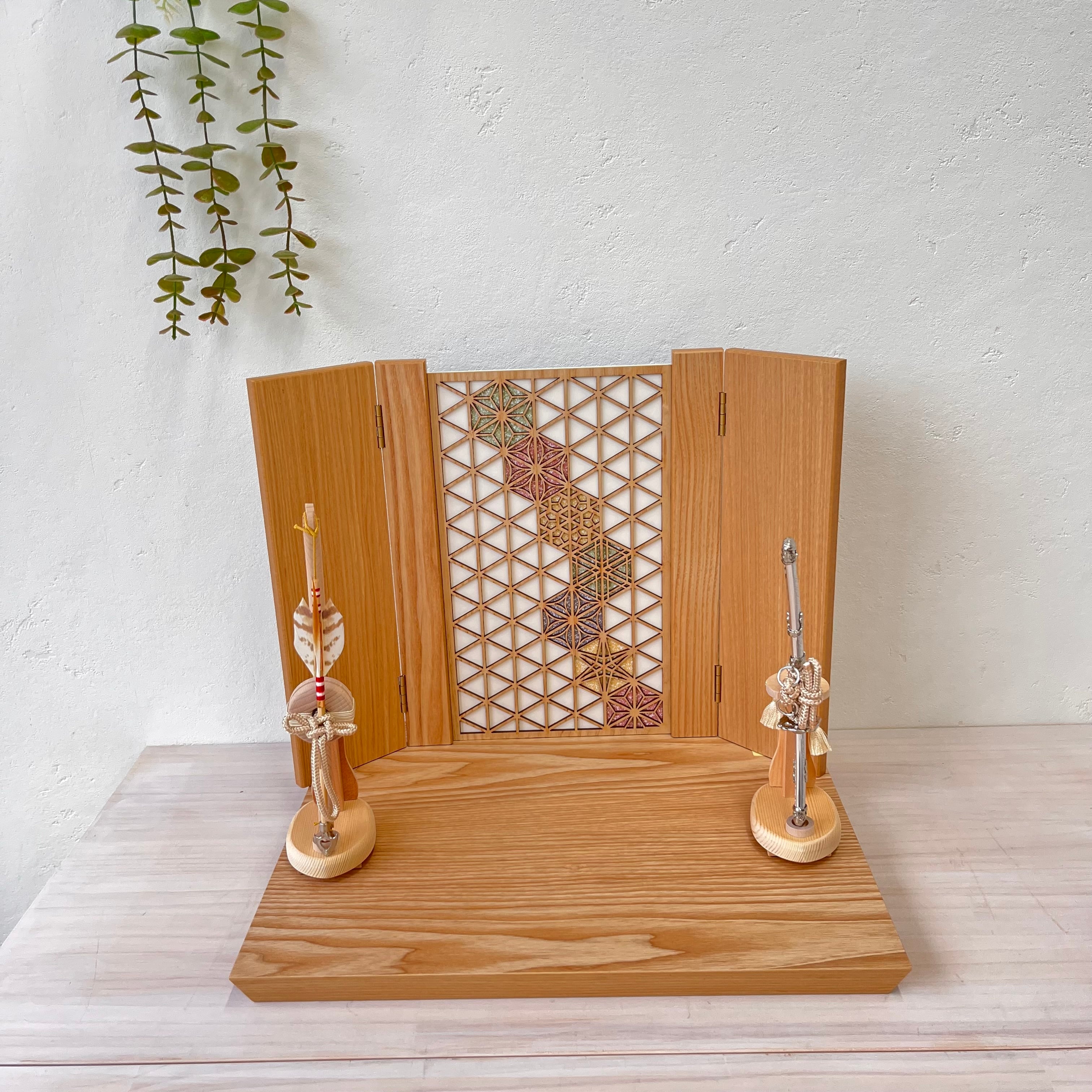 ## 商品名:匠 8号 黒小札グレー縅糸 麻の葉飾り台